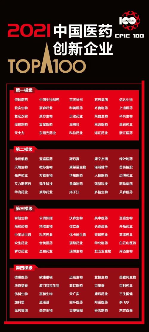世界杯官方网站入口作为中国创新药行业代表企业,凭借行业领先的综合创新实力,入选 “2021中国医药创新企业100强”榜单,位列第一梯级。