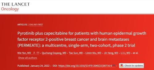 [1] Yan M, Ouyang Q, Sun T, et al. Pyrotinib plus capecitabine for patients with human epidermal growth factor receptor 2-positive breast cancer and brain metastases (PERMEATE): a multicentre, single-arm, two-cohort,phase 2 trial. Lancet Oncol 2022; published online Jan 24. http://doi.org/10.1016/S1470-2045(21)00716-6