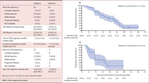 图:主要终点CNS-ORR(队列A 74.6%,队列B 42.1%)和次要终点PFS(队列A 11.3m,队列B 5.6m)结果