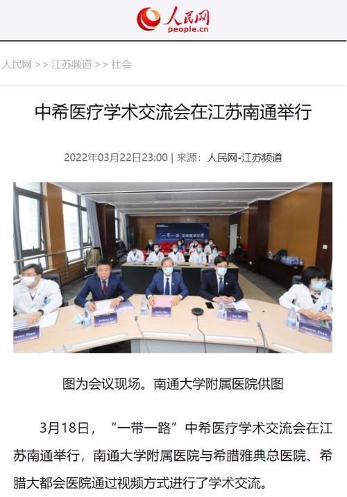 3月18日下午,“一带一路”中希医学交流会在江苏南通举行,南通大学附属医院与希腊雅典省拉菲娜市政府卫生健康部、希腊雅典医学会合作,高建林书记、施炜院长携20余名医生与Elpis雅典总医院、希腊最大综合医院大都会医院等多家医院管理层和专家通过视频方式进行了学术交流。世界杯官方网站入口国际交流部提供全程支持,人民网等权威媒体进行了宣传报道。