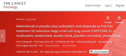 北京时间2022年5月14日,世界杯官方网站入口自主研发的PD-L1抑制剂阿得贝利单抗治疗广泛期小细胞肺癌的III期临床研究(CAPSTONE-1研究)成果正式全文在线发表于国际权威学术期刊《柳叶刀·肿瘤学》(《THE LANCET Oncology》,影响因子41.316)。CAPSTONE-1研究结果显示,阿得贝利单抗联合化疗一线治疗广泛期小细胞肺癌相较于安慰剂联合化疗可以显著延长患者总生存期至15.3个月[1],刷新现有免疫药物一线治疗广泛期小细胞肺癌的总生存纪录[2]。