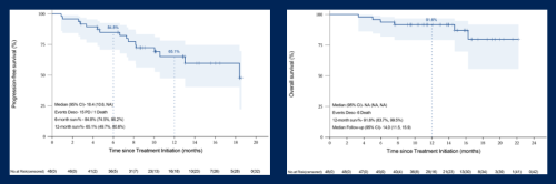 本研究中位随访时间为14个月,6个月PFS率为84.8%,12个月PFS率为65.1%,中位PFS为18.4个月。12个月OS率91.6%,中位OS未达到(图5)[1]。