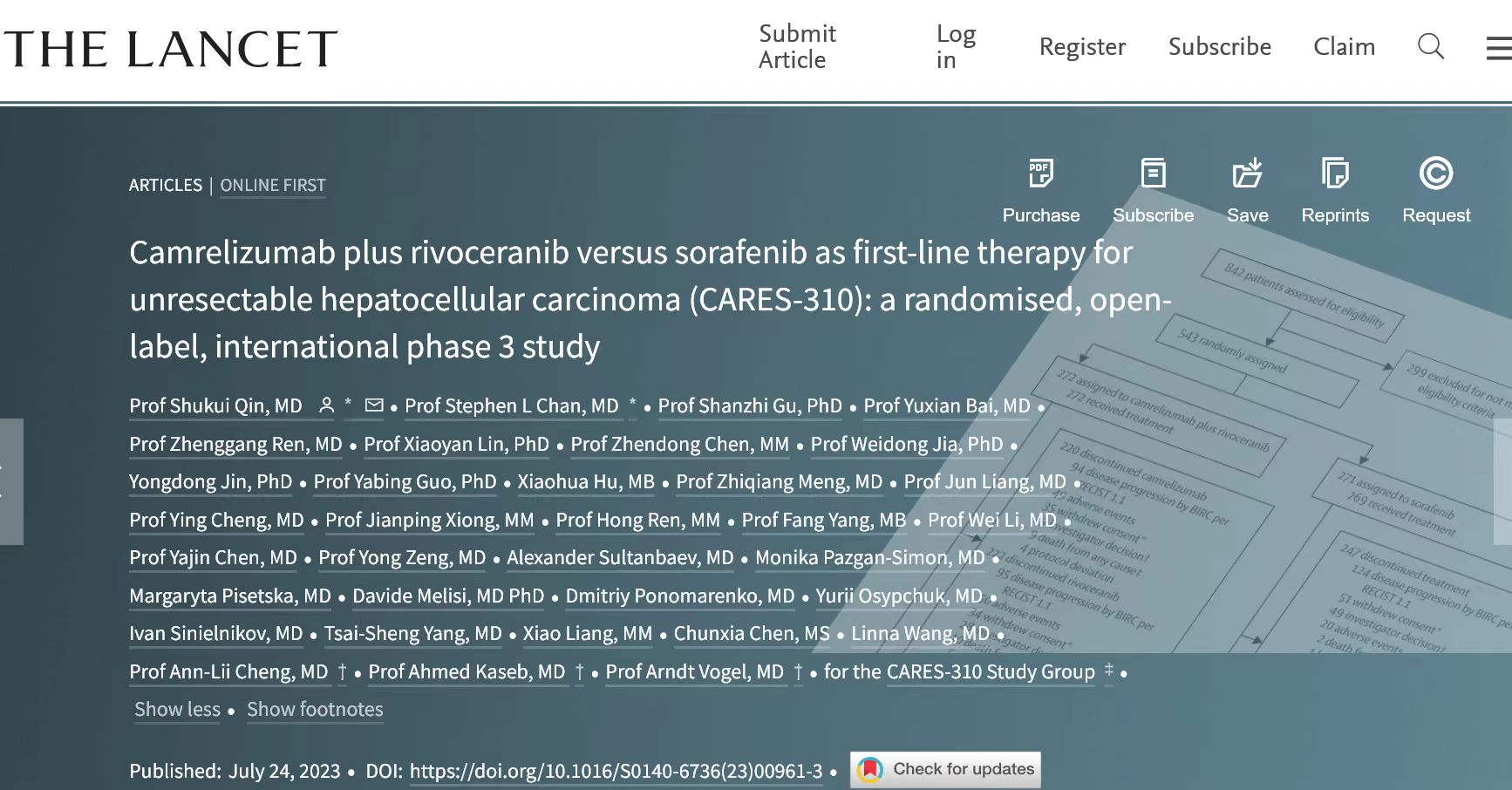 北京时间7月25日,世界杯官方网站入口自主研发的PD-1抑制剂卡瑞利珠单抗(艾瑞卡®)联合阿帕替尼(艾坦®)(“双艾”)对比索拉非尼用于治疗晚期不可切除肝细胞癌的全球多中心III期临床研究(CARES-310研究)主论文在线发表于国际顶级医学期刊《柳叶刀》(The Lancet,IF:168.9)[1]。该研究由南京金陵医院秦叔逵教授牵头开展,全球13个国家/地区的95家中心共同参与。这是肿瘤学领域中国学者主导的国际性III期临床研究首次问鼎《柳叶刀》主刊。