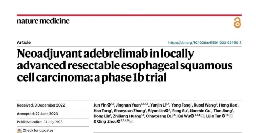 [1].Yin J, Yuan J, Li Y, et al. Neoadjuvant adebrelimab in locally advanced resectable esophageal squamous cell carcinoma: a phase 1b trial [published online ahead of print, 2023 Jul 24]. Nat Med. 2023;10.1038/s41591-023-02469-3. doi:10.1038/s41591-023-02469-