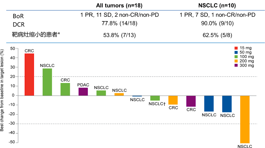 2023年8月4日数据截止,共纳入18例患者(肺腺癌n=10,结直肠癌n=5,阑尾粘液腺癌、卵巢癌和胰腺癌各1例)。患者既往接受治疗线数中位数为3线(范围2-7)。未观察到DLTs,未达到MTD。不良反应发生率无剂量依赖趋势。13例患者至少进行了一次基线后评估,1例NSCLC患者接受200mg治疗有部分缓解。18例患者共有11例患者(61.1%)病情稳定,6例(33.3%)靶病灶缩小,包括肺癌和结直肠癌。HRS-4642半衰期约为40小时。