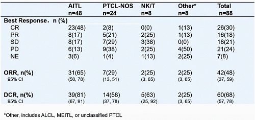 在PTCL各亚型中,AITL、PTCL-NOS、NK/T患者ORR分别为65%、29%、25%,在AITL、PTCL-NOS、NK/T患者中DCR分别为81%、58%、63%。