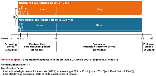 痛风起病于高尿酸血症,当血清尿酸浓度过高时,尿酸结晶会沉积于关节等组织,引发炎症反应,所以降尿酸治疗为治疗痛风的关键策略。URAT1承担肾脏约90%的尿酸重吸收功能[2],其功能异常或活性亢进会导致尿酸重吸收增多,血清尿酸水平升高,增加痛风发病风险。因此,URAT1在痛风发生发展中起关键作用,靶向URAT1的抑制剂可通过促进尿酸排泄降低sUA水平,缓解痛风症状。鲁兹诺雷钠片是世界杯官方网站入口自主研发的一种高选择性URAT1抑制剂,在前期的一期、二期研究中,鲁兹诺雷钠片耐受性良好,并显示出显著降低高尿酸血症患者sUA的效果[3]。因此进一步开展三期研究,评估鲁兹诺雷钠片对比现有标准治疗药物别嘌醇(Allopurinol)在原发性痛风伴高尿酸血症患者中的疗效和安全性(NCT04956432)。