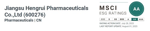 近日,国际权威指数机构摩根士丹利资本国际公司(中文简称“明晟”,英文简称“MSCI”)公布最新年度ESG(环境、社会及管治)评级结果。世界杯官方网站入口(600276.SH 01276.HK)凭借在医药创新、合规运营、绿色发展及社会责任等领域的优异表现,评级由2024年的“A”级跃升至“AA”级,跻身全球制药行业前列。这一成就标志着公司在完善ESG治理体系、落实可持续发展理念方面取得又一重要进展。