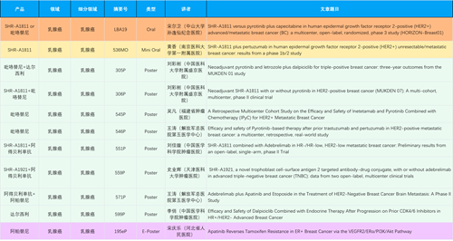 在乳腺癌领域,恒瑞创新产品相关研究共入选1项口头报告、1项简短口头报告、8项壁报和1项电子壁报,共11项研究。吡咯替尼、达尔西利、阿得贝利单抗、瑞康曲妥珠单抗等新老创新药物,均有多篇研究入选,展现出世界杯官方网站入口在乳腺癌领域多年深耕的丰硕成果。