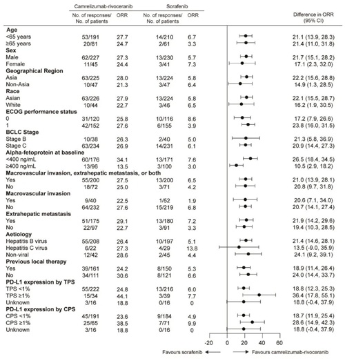 最终分析时,BIRC依据RECIST 1.1标准评估的结果显示,“双艾”方案组的客观缓解率(ORR)优于索拉非尼组(27%[73/272] vs. 6%[16/271]),两组差异为21%(95% CI:15%-27%)。此外,“双艾”方案组的中位至缓解时间(TTR)更短(1.9个月 vs. 3.7个月)。该ORR获益在绝大多数预设亚组中均保持一致,详见下图。