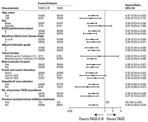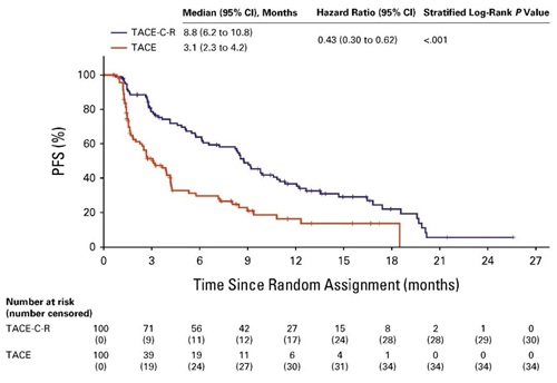 按照改良版实体瘤疗效评价(mRECIST)标准评估的中位PFS与RECICL 5标准评估的结果一致(8.8个月[95% CI,6.2-10.8] vs 3.1个月[95% CI,2.3-4.2];HR 0.43[95% CI,0.30-0.62], P<0.001)。PFS的事后亚组分析显示出获益的一致性趋势。TACE-C-R组的中位至疾病进展时间(TTUP)为13.7个月(95% CI,10.7-19.6),TACE组为3.9个月(95% CI,2.5-5.7)。生存随访进行中。