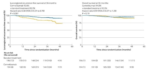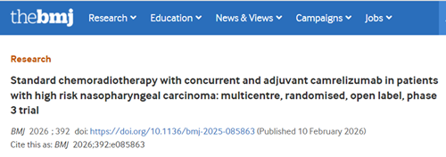 [1]You R, Xu GQ, Ding X, et al. Standard chemoradiotherapy with concurrent and adjuvant camrelizumab in patients with high risk nasopharyngeal carcinoma: multicentre, randomised, open label, phase 3 trial. BMJ. 2026;392:e085863. Published 2026 Feb 10. doi:10.1136/bmj-2025-085863