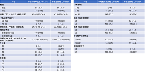 该研究于2020年8月至2022年6月在中国7家医院开展,入组了390例年龄18-70岁、经组织病理学确诊为非角化型鼻咽癌(分化型或未分化型)、Ⅳa期(T4或N3,AJCC第八版)或Ⅱ-Ⅲ期(经诱导化疗后影像学评估为疾病稳定/疾病进展或外周血可检测到EBV-DNA)、KPS≥70分的高危局晚期鼻咽癌患者。患者按照1:1随机分为卡瑞利珠单抗组(194例)和标准治疗组(196例)。