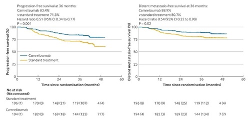 ● 中位随访39.9个月的结果显示,卡瑞利珠单抗组36个月无进展生存率高达83.4%(95% CI:78.3%-88.8%),显著高于标准治疗组的71.3%(95% CI:65.2%-77.9%),疾病复发或死亡风险降低49%(HR=0.51,95% CI:0.34-0.77,P=0.001),达到了主要研究终点。